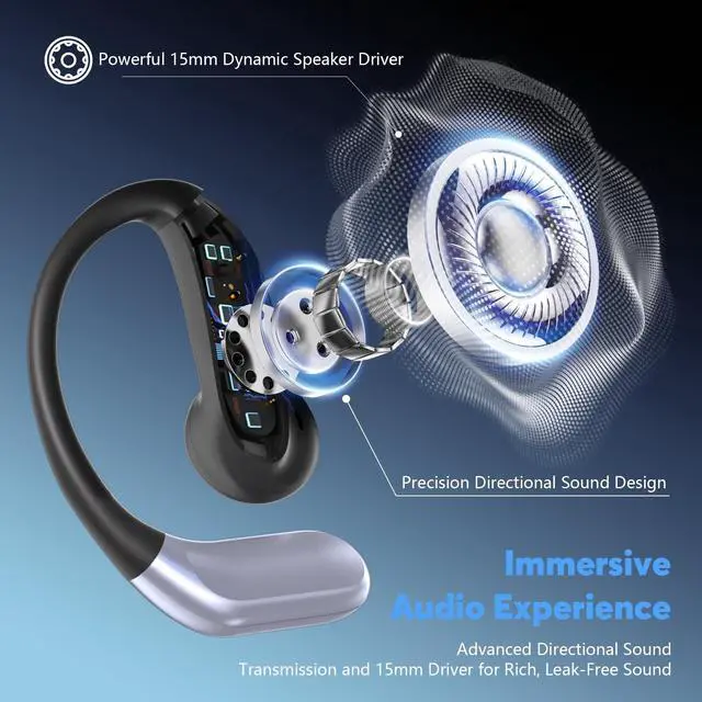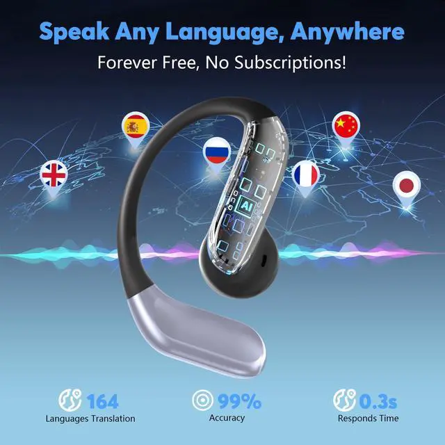 The soft silicone ear hooks provide a secure fit, making them ideal for sports, workouts, and daily activities. ^^ [Built-in 6 HD ENC Mics for Stereo HiFi] - Compared to other open ear headphones, YYK-Q102 AI translation headphone not only combined clip on design and in ear features to provide full comfort for daily wearing, also have built in 6 HD ENC mics which can accurately record sound even in noisy environments, providing you with crystal clear sound quality and ensuring more accurate translation of communication content. ^^ [Up to 60 Hours of Playback] - These Bluetooth marvels house a robust lithium battery fortified with Energy Lock technology, guaranteeing a staggering 10 hours of uninterrupted playtime per charge.