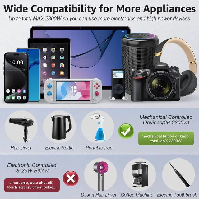 With 3 AC US outlets and 4 kinds USB ports which including Type-C & QC charging, you can use it to charge multiple devices in a time, even for a family travel ^^ High Power Makes MORE Devices Working With high 2300W total power, our converter will be able to compatible with more electronics, not only work on cell phone, ipad, laptop, tablet, blue-tooth speaker, but for cooking machine, hair dryer, air purifier, rice cooker, electric kettle, etc., as long as your devices are mechanical controlled and between 26W - 2300W ^^ Protect Your Devices while Using a Converter Safety Guaranteed designed with over-voltage, over-current, over temperature, short circuit protection and surge protection, and also inside cooling fans, this power converter will run in a stable condition to support security devices using ^^ IMPORTANT to Check Before the Purchase As we advertised on description and pictures, this voltage converter will NOT work for electronic controlled devices that operated by smart chip, auto on/off, touch screen, timer or pulse function etc.