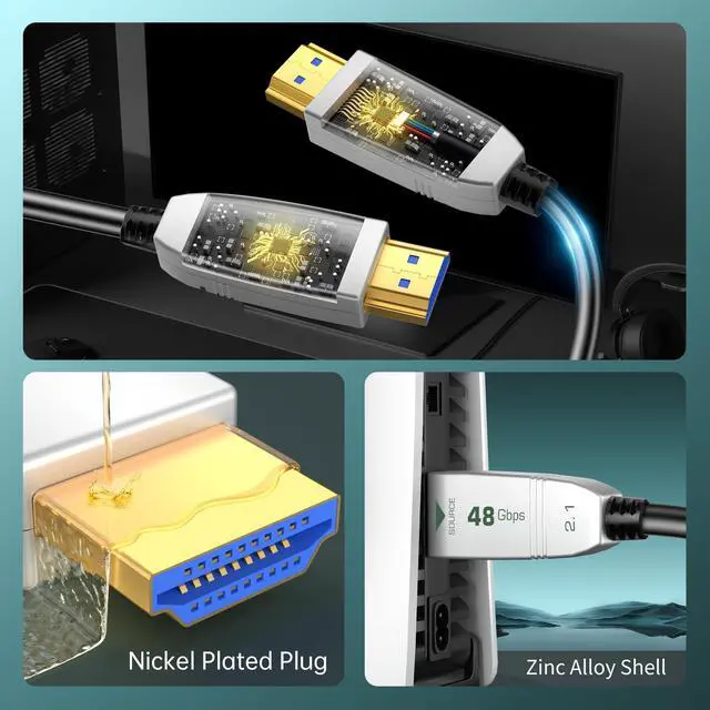 HDMI 2.1 Cable: FeizLink Fiber Optic HDMI Cable complies with the standard HDMI 2.1 version with up to 48Gbps transmission speed to eliminate frame jamming and frame loss during viewing. This HDMI cord supports resolutions and refresh rates up to 8K@60Hz and 4K@120Hz for immersive viewing and smooth fast-action details, and resolutions up to 10K. Dynamic HDR formats are also supported