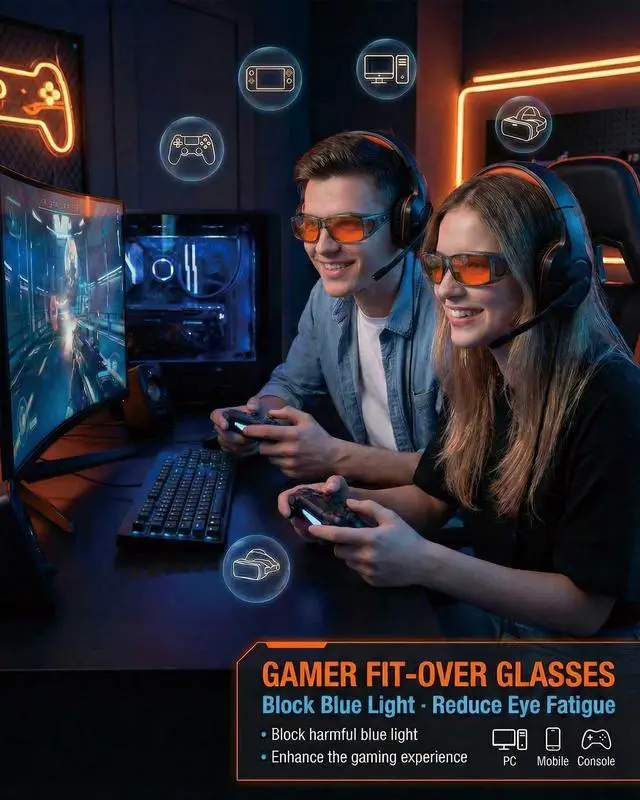 SUPERIOR COVERAGE & MIGRAINE DEFENSE: Engineered for sensitive eyes, OptiCraft fit-over design blocks 99-100% of blue light and filters specific migraine-triggering wavelengths (480-520nm) to significantly minimize tension headaches. Equipped with premium multi-layer coatings, these lenses feature Anti-Glare properties to reduce screen reflections. ^^ ENHANCE FOCUS & ELIMINATE EYE STRAIN: Stay immersed in long gaming sessions with a lightweight frame that fits over prescription glasses and pairs perfectly with headsets; by blocking UV400 and harmful blue light, these OptiCraft glasses prevent dry eyes and visual fatigue, keeping your vision comfortable and protecting your natural sleep cycle from melatonin disruption ^^
