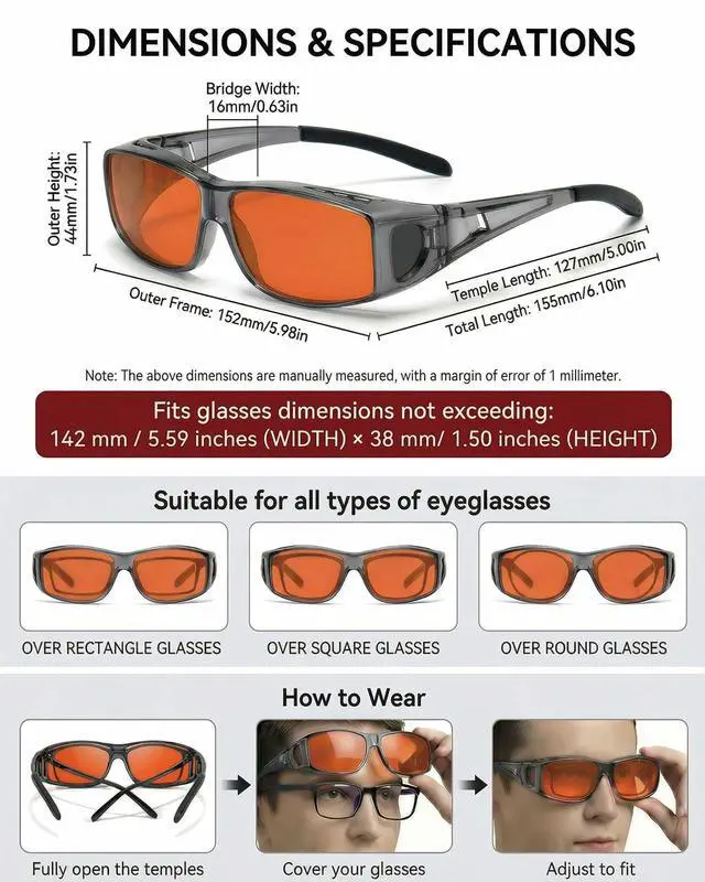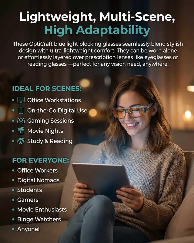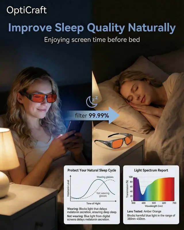 ERGONOMIC FIT-OVER DESIGN & PREMIUM BUILD: Specifically engineered to fit seamlessly over standard prescription eyewear, our OptiCraft glasses feature a wraparound structure with side shields for maximum peripheral protection. Constructed from premium PC material, the frames are sturdy and flexible yet incredibly lightweight to ensure compatibility with various temple arm thicknesses without adding bulk. ^^ OPTIMIZED FOR SLEEP & EVENING RELAXATION: Perfect for use after 7 PM during late-night gaming or bedtime scrolling, these lenses create a warm, amber-orange tinted view that cuts through harsh artificial light to instantly relax your eyes. By wearing them 2-3 hours before bed, you prevent blue light from suppressing melatonin production, effectively signaling your body it is time to rest so you can fall asleep faster and improve overall sleep quality. ^^