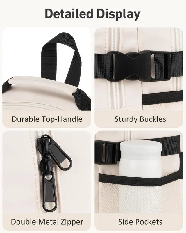 Water Resistant MaterialBackpack to a certain extent to block the entry of water, which means backpack in a short time to receive a small amount of drizzle, water droplets will soon roll down the fabric, will not penetrate into the backpack items; Otherwise, prolonged exposure to rain or heavy rain will overwhelm the contents of the backpack. Durable and wear resistantReinforced firmness adds enough security to the seams, handles and straps. Two side pockets2 Side pockets can hold a water bottle and an umbrella, small itemsBack Luggage StrapA luggage strap allows backpack fit on luggage/suitcase, slide over the luggage upright handle tube for easier carrying.