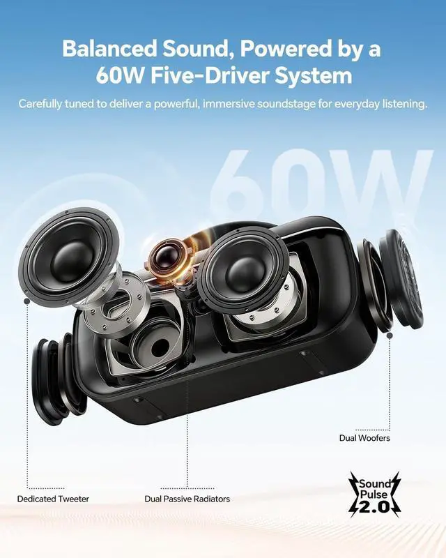 Powerful Stereo & Enhanced Bass: Feel the beat with 60W of peak power, delivering room-filling sound. One-touch BASS boost button instantly intensifies low frequencies for a deep, rich, and immersive audio experience at any volume. Its custom-built racetrack subwoofer delivers deeper, fuller bass with enhanced clarity, making every song hit with powerful precision and depth ^^ Bluetooth 6.0 & Smart