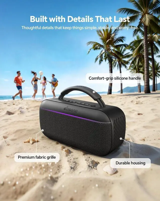 Water Resistance: Engineered for lifes adventures, this speaker features an ultra-durable body crafted from a rugged fusion of shock-resistant ABS, grippy silicone, and tear-resistant nylon fabric. Rated IPX5 water-resistant, it handles splashes, light rain, and poolside use with confidence. Whether youre hiking rocky trails, relaxing at the beach, hosting a backyard BBQ, or working in the garage, the integrated soft-grip handle ensures easy portability and a secure hold ^^ Wireless Party Mode & USB-C Connectivity: Instantly sync multiple speakers to create one powerful, room-filling sound experienceperfect for parties, events, and whole-home audio. Use TWS pairing to connect two speakers as left and right channels for true stereo. The USB-C port ensures stable wired playback when needed. ^^