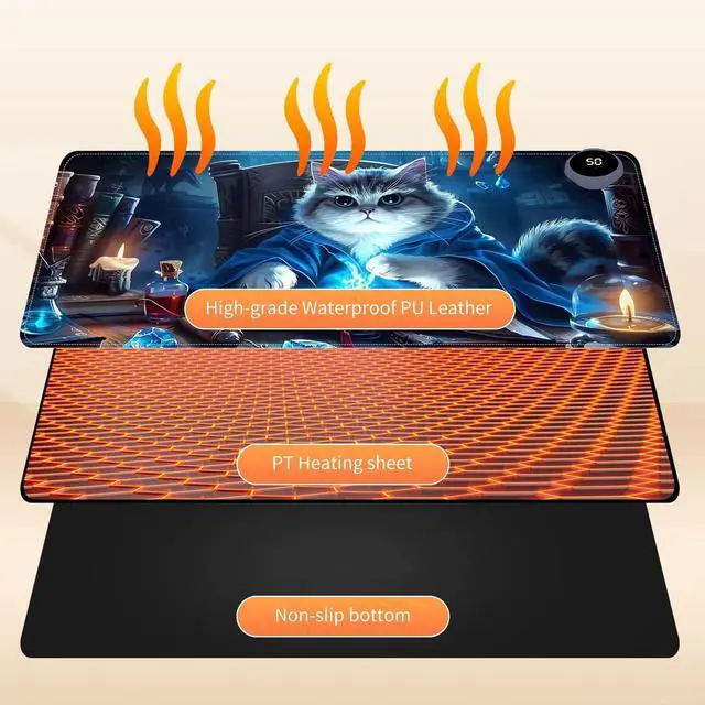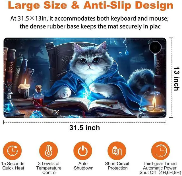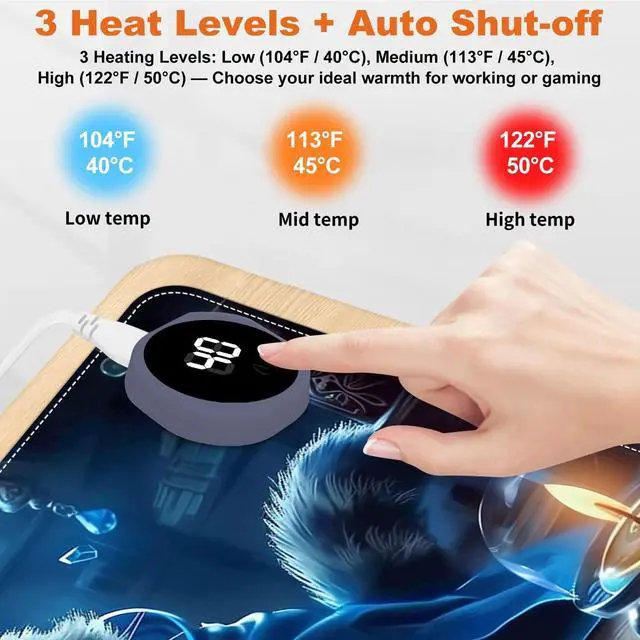 Stay warm and productive during the cold months with this large 31.5" x 13" Heated Mouse Pad. Featuring 3 adjustable heat levels (104F / 113F / 122F), it delivers consistent warmth for your hands and wrists while working or gaming. Made from premium PU leather, the surface is waterproof, easy to clean, and comfortable to the touch. Unlike USB-powered models, this desk mat uses a plug-in electric power source for faster and more stable heating. An automatic 3-hour shut-off timer ensures safety and energy efficiency. The mat is rollable and portable, making it ideal for both office and remote workspaces.