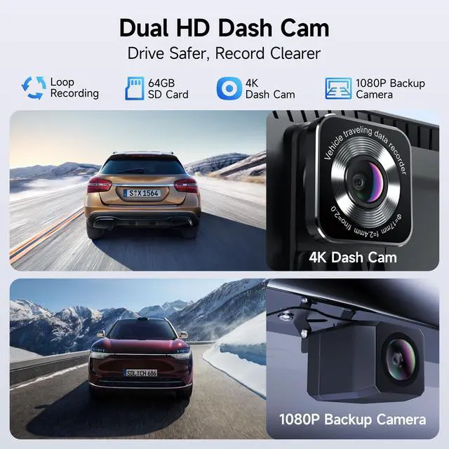 Camera: Front and rear dual recording function to fully protect your driving safety. Ultra-clear front recording camera, 170 ultra-wide angle shooting, standard with 64GB memory card, loop recording driving picture. 1080P HD reversing camera (18ft cable), provide clear rear view when reversing, parking more easily.