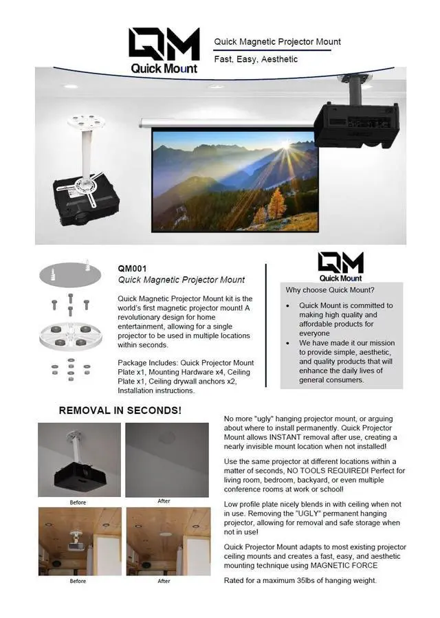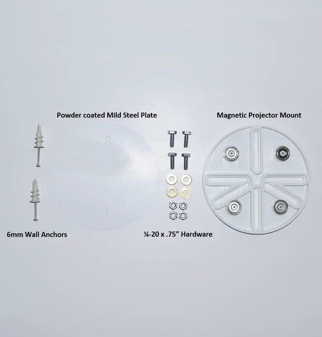 Quick MAGNETIC Projector Mount. Introducing the worlds first magnetic projector mount! Quick Mount has created a revolutionary design for home entertainment, allowing for a single projector to be used in multiple locations within seconds. No more "ugly" hanging projector mount, or arguing about where to install it perminenetly. Quick Projector Mount allows instant removal after use, creating a nearly invisible mount location when not in use. Quick Projector Mount that adapts to most existing projector ceiling mounts and creates a fast, easy, and aesthetic mounting technique using magnetic force Install and remove the projector between different locations within a matter of seconds, NO TOOLS REQUIRED! Use one projector in different locations such as living room, bedroom, backyard, or even different conference rooms at work or school! Low profile ceiling plate nicely blends in with ceiling when not in use.