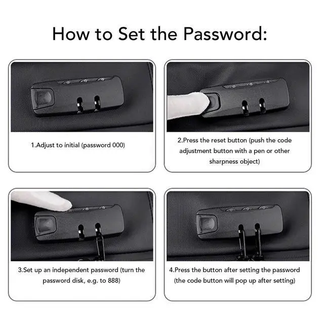 Password: 1. Adjust to initial (password 000) 2. Press the reset (push the adjustment with a pen or other sharpness object) 3. Set up an independent password (turn the password disk, e. g. to 888)4. Press the after setting the password (the will up after setting) How to