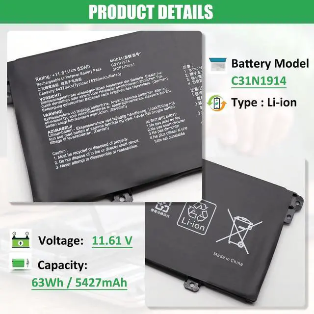 COMPATIBLE PART NUMBER: Battery C31N1914, 0B200-03730100, 3ICP6/70/81 ^^