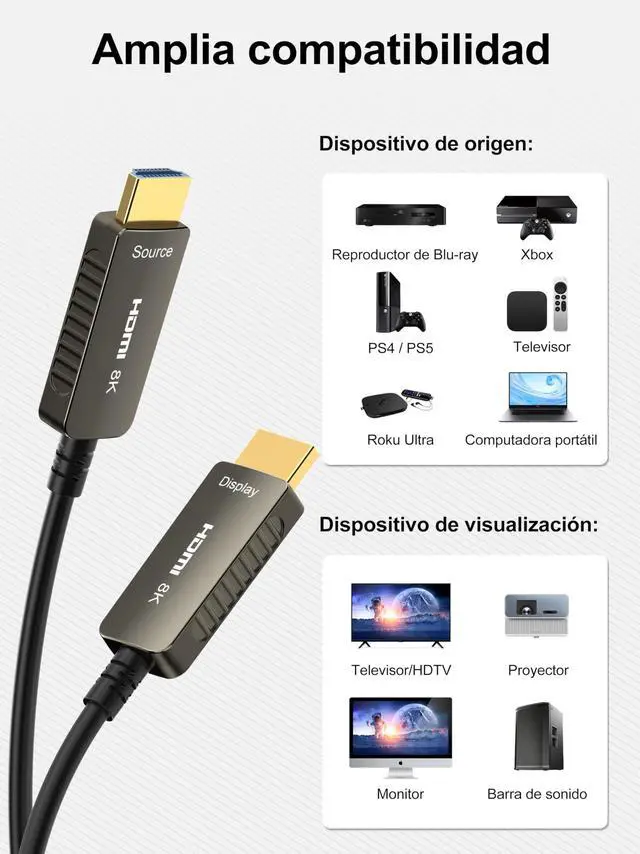 [Note] This series of products must be connected in the correct direction before use. SOEYBAE 8K HDMI Fiber Optic Cable, support 8K@60Hz, 4K@120Hz, 48Gbps, HDCP 2.2, 4:4: 4, 16bit. It is applicable to all devices adopting HDMI 2.1 standard and backward compatible with previous HDMI 2.0, 1.4, 1.3, 1.2, 1. ^^ Supports ultra high speed transfer rate up to 48Gbps. It is 2.5X the Bandwidth of HDMI 4K 2.0 cables. much faster than HDMI 2.0 and HDMI 1.4. Supports Dynamic HDR, ^^ All our 8K HDMI 2.1 Cable fiber cords are compatible with all kinds of HDMI devices, such as Playstation, Xbox Series, Switch, 8K 4K UHD TV, Laptop, PC, DVD players, PS5, PS3, PS4, Blu-ray players, projectors, AV receivers, media box, and more. ^^ Ultra Durable Flexible, 24K golden-plated Type-A connectors, bare copper conductors, durable and environmental PVC jacket, Minimize interference and no black screen, ensure image/sound quality. provide amazing clarity and real sound for your ultimate viewing experience. ^^ Welcome to contact us if you have any questions or concerns. Our reliable Customer Service will be sure to reply within 24 hours and offer proper solutions for you.