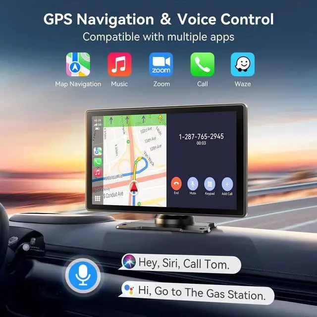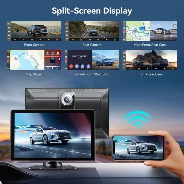 Wireless Carplay & Android Auto- 8.98" HD touchscreen carplay screen for car with Bluetooth seamlessly connects to smartphones. Instantly syncs apps, maps, calls, and music via Carplay/Android Auto. Voice control with Siri & Google Assistant enhances driving safety. ^^ Real-Time GPS Navigation- This portable Apple CarPlay screen for car supports Google Maps, it integration provides traffic updates and lane guidance. Mirror smartphone navigation to the screen for precise routing. (For Carplay & Android Auto mode use only. ) ^^ 4K Dash Cam + 1080P Backup Camera- This Android auto screen support dual recording with 4K front camera (road view) and night vision rear camera (33ft).