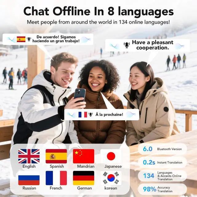 ^^ ENC Noise Reduction & Premium Sound QualityENC noise-canceling microphones filter environmental noise, ensuring clear communication during multi-language conversations with ai translation earbuds. Equipped with 13mm dynamic drivers, enjoy rich bass, bright mids, and clear highs for immersive calls and music with ai translator earbuds. ^^ 60-Hour Long Battery LifeSupports Type-C fast chargingfully charged in just 1.5 hours. Enjoy 8 hours of continuous use per charge, with a total of up to 60 hours using the charging case. Perfect for long trips and multi-scenario usage with your ear buds translators any language.