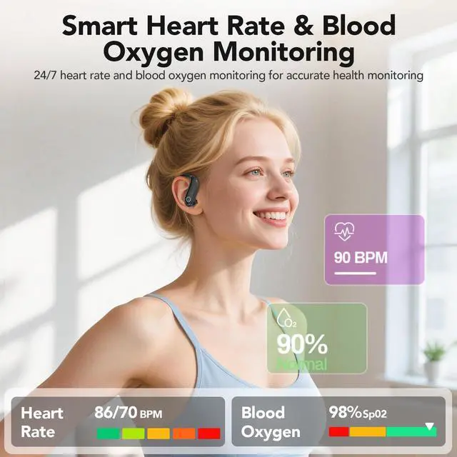 When watching videos, activating AI subtitles instantly translates and displays captions via ai translation earbuds, helping you overcome language barriers and enjoy global content effortlessly. ^^ Heart Rate & Blood Oxygen MonitoringThese sport-friendly ai translator earbuds track your health during workouts. After exercise, simply wear the earbuds while at rest and check your heart rate and blood oxygen levels with a single tap on the LCD screen. Precise sensors provide accurate readings without extra devices, helping you monitor recovery and exercise safely with your earbud translator in real time. ^^ Multifunctional LED DisplayThe high-definition color touchscreen makes operation intuitive.