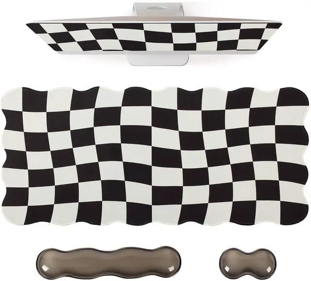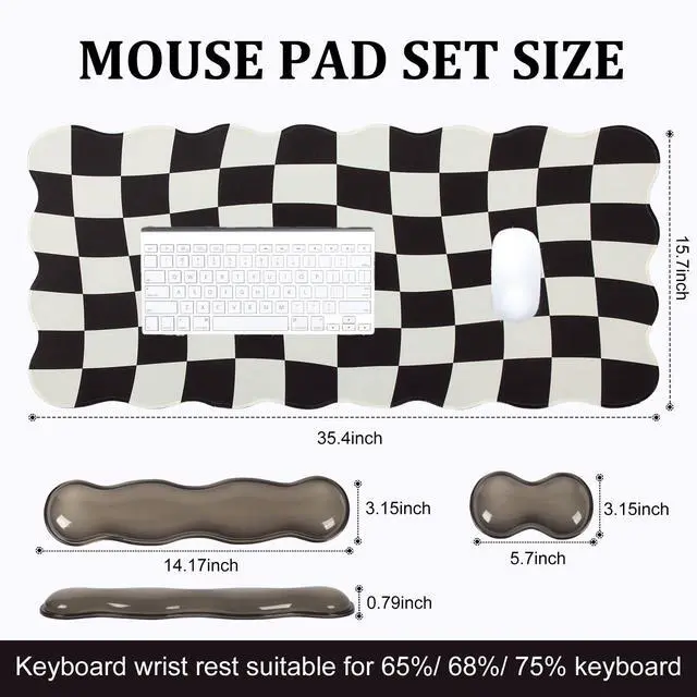 3Pcs Scalloped Desk Mat Set- Groovy gaming mouse pad with wrist rest set package includes large black checkered desk mouse pad, gel clear black keyboard wrist pad, gel clear black mouse wrist rest, feature a scalloped edge design, making it more stylish. The minimalist black desk pad mat with exquisite stitched edges for wear resistance and durability, adding a touch of elegance to your desktop ^^ Gel Wrist Rest for Keyboard and Mouse- Silicone gel material of this wrist rest set provides a comfortable and supportive surface for your wrists while typing or using a mouse.