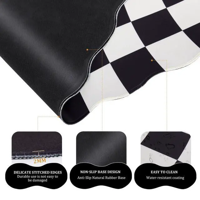 Clean: Black large desk pad, silicone gel wrist rest for keyboard and mouse equipped with a waterproof coating, resist liquid spills. The black checkered computer mat for desk is washable: hand wash easily cleaned with a wet cloth or washing machine. Water resistant and heat resistant material makes this gaming mouse pad easy to clean ^^ Exquisite Gift-The black groovy checkered desktop mat provides ample space for your mouse, gaming keyboard, and other desktop essentials. Its large size keeps your workspace neat and organized, perfect for both gaming and office use. The geometric black desk matt for desktop is exquisite and durable, making it an excellent gift for family, friends and oneself