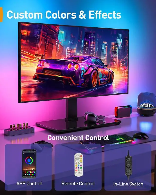 Vibrant LED LightingThis premium TV stand features rich multicolor lighting to create the perfect ambiance. Pick colors from the 16.8 -million-color RGB spectrum, choose lighting effects, change effect speed, and adjust brightness. Control the lighting your way via the phone app, remote control, or in-line remote. Theres also a music sync mode that brings your music alive with the lights dancing to the beat! ^^ Wide CompatibilityThe Universal TV stand Holds Most TVs with LED Lights fits 32", 40", 42", 43", 50", 55", 60", 65", 70" flat-panel LCD/LED TVs, with VESA pattern sizes from 100x100mm, 100x200mm, 200x100mm, 200x200mm, 200x300mm, 300x200mm, 300x300mm, 400x200mm, 400x300mm, 400x400mm, Please verify the VESA pattern of your TV before purchase.