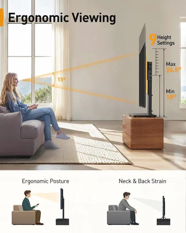 ^^ SWIVELS 60 - Maximize Your Viewing ExperienceThis tabletop TV stand gives you the right viewing height with nine height adjustment settings from 18 to 24.5. It also tilts up 8 and swivels +/-30 for the optimal viewing angle, reducing neck and eye strain. ^^ 9 Levels of Height AdjustmentThe TV table stand offers 9 height configurations with 3 installation positions on the column and 3 height choices on the brackets. Holds up to 70" TVs and soundbars with a screen center height of 24.6", this will give you more space to place your cable box, DVD player, sound bar.