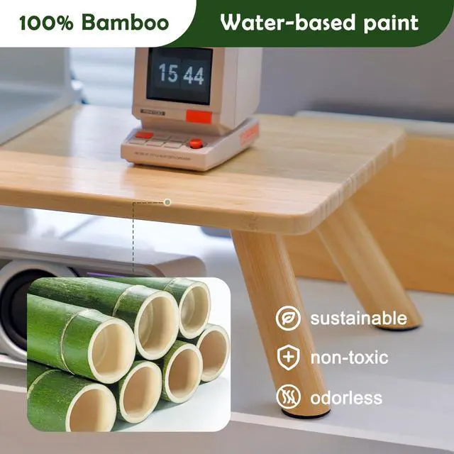 ^^ Solid Bamboo Structure: Built with reinforced bamboo panels, the stand supports up to 33 lbs, providing reliable stability for monitors, laptops, printers, and other desktop devices.