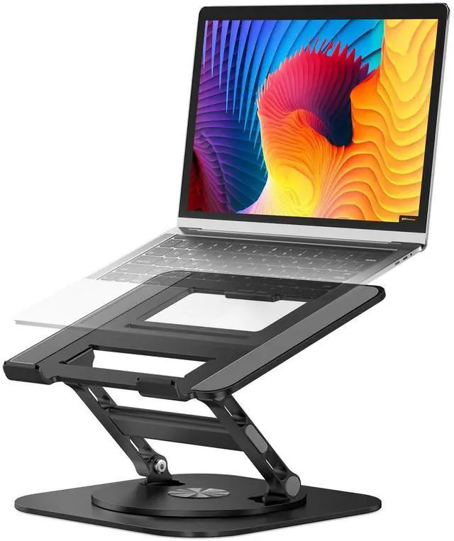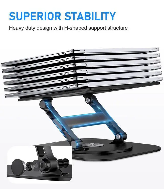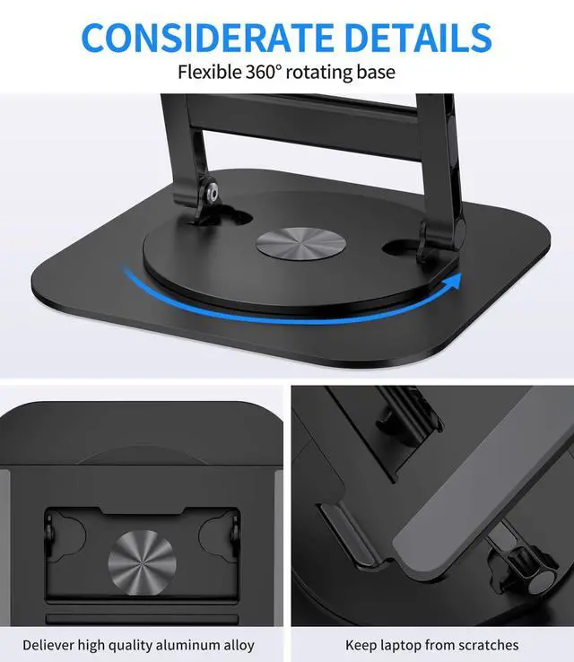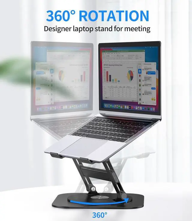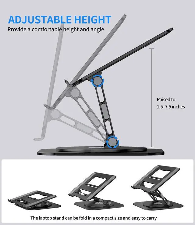 360 Degree Rotation with Sturdy SupportThis laptop desk stand can rotates on its centered round base, allowing the top half of the stand to rotate infinitely in either direction. This give you plenty of flexibility in terms of working position. It will be especially useful for group projects or meetings. What's more, featured with sturdy H-shaped support structure which make it more stable than normal laptop stands. ^^ Adjustable Laptop StandThis computer stand is designed with adjustable in height and angle, so you can raise your laptop screen to a more ergonomic viewing height which is better for maintaining a healthy posture.