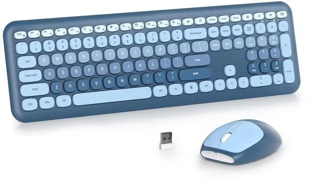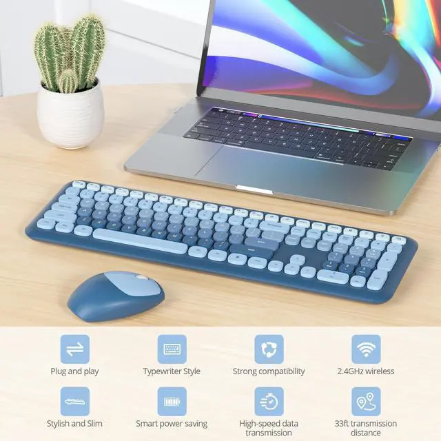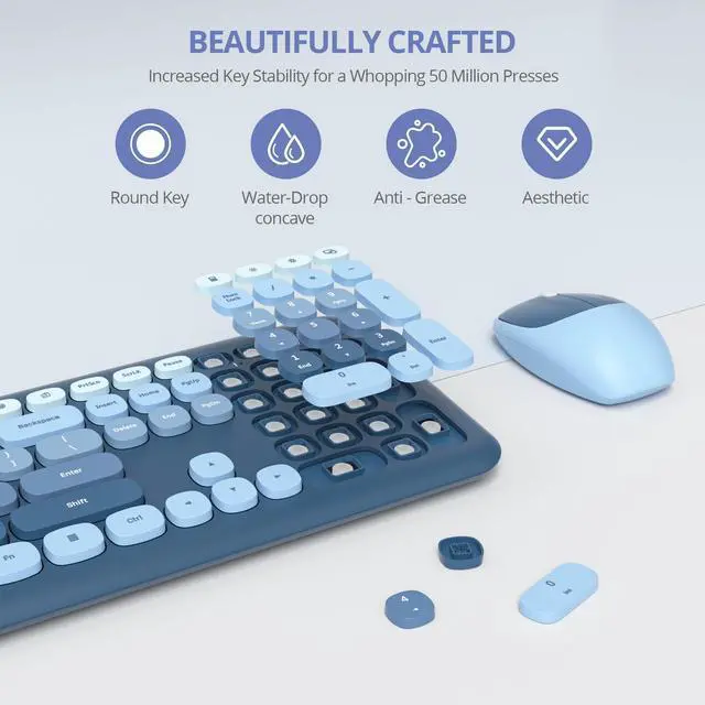 Reliable Plug and PlayThe 2-in-1 USB receivers enable using the keyboard and mouse separately or togetherno drivers and complex setup needed. Stable 33Ft signal range fits home, office or study. ^^ Smart Auto-Sleep ModeIntelligent auto-power saving extends battery life: enters sleep mode after 5 minutes of inactivity, wake with any key. Package includes 1 AAA for keyboard, 1 AA for mouse. ^^ 104-Key Full Size KeyboardThis cute blue keyboard includes standard layout with full-size F-keys, number pad, and arrow keys. 13 multimedia keys allow seamless control over media and system settings during tasks like working, gaming, or streaming. ^^ Retro Typewriter KeyboardThe typewriter-style keyboard boasts round concave keycaps offering a soft touch, low noise design, and a creamy-like typing experience, ideal for writers, designers, vintage tech enthusiasts, or anyone seeking to infuse their workspace with character. ^^ Broad CompatibilityThe aesthetic wireless keyboard and mouse combo is compatible with a wide range of systems, including Windows 2000, XP, 7, 8, 10, and Vista. Ideal for PCs, desktop computers, and laptops. Multimedia shortcuts are not compatible with Mac systems.