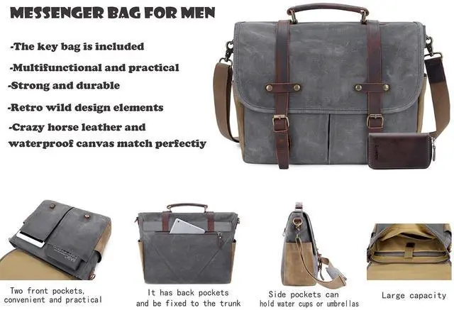 DescriptionThis laptop messenger bag is a perfect satchel bag you don't want to miss. Made of crazy horse leather and detailed with disordered wrinkles and scratches, this canvas messenger bag will make wearer stand out of all, as it presents the style of retro and wildness and form a special skin effect to make it the first choice in major brands. * Briefcase is designed with plenty room of 9 pockets, ends chaos and keeps everything in their right position. You can also take your laptop in it for business, school, everyday, overnight and other situations, as there is padded laptop sleeve will protect your computer.