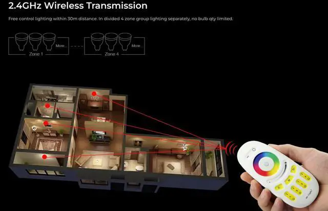 2.4GH z RF Technology: Stable and interference-free wireless control with a range of up to 30 meters. Smooth Dimming &