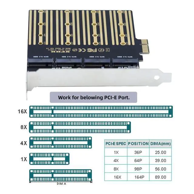 The PCI-E slot is 1x and also support 4x/8x/16x. ^^ It has four SATA 3.0 interfaces, which can be connected to an SSD solid state hard disk as a system disk, and supports transmission rates of 6.0G bps, 3.0G bps, 1.5G bps. ^^ With hot swap and hot plug capabilities, and power management functions; ^^ Supoort SATA NGFF Key B+M SSD with 2230/2242/2260/2280. ^^ It has PCI-E 1x interfaces, which can be connected to four SSDs, and supports desktop motherboard PCI-E port.