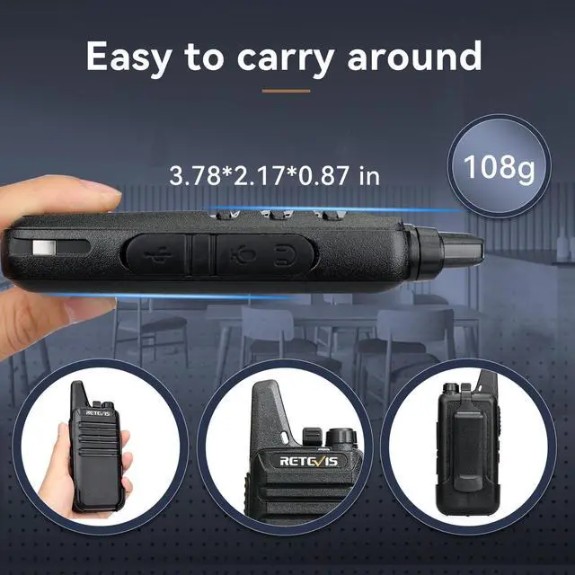 Pocket size and slim look is perfect use in restaurant; school; supermarkets; hotel; franchise stores; and more large; medium-scale or multi-storey workplaces ^^ Easy to use; two way radio is featured with VOX hands free; emergency alarm; squelch; emergency alarm; without complicated operation ^^ Rechargeable Li-ion battery can last 12 to 24 hours; USB charging design; allowing you to focus on your work without worrying about battery life ^^ Lightweight and durable back clip design allows you to install and remove quickly; short antenna design; you can easily put it in your pocket without worrying about getting stuck or protruding ^^ Ready to use out of the box; the RT22 combines range, audio clarity, and hands-free operation; makes it an essential tool for seamless communication in various settings