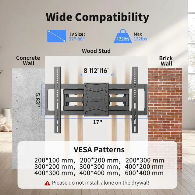 UNIVERSAL: This TV wall mount fits most 37 to 86 inches LCD, LED, or Plasma flat/curved screen TV/monitor up to 132lbs, for VESA 200x100mm-600x400mm. Designed for max wall studs with 16" centers.
