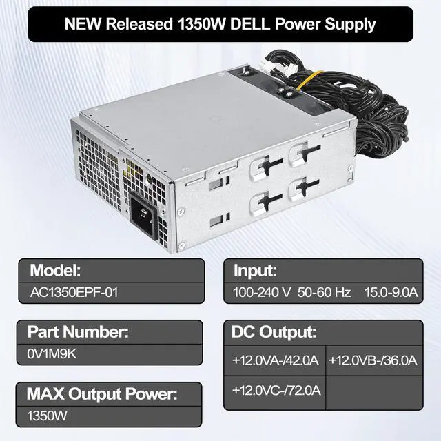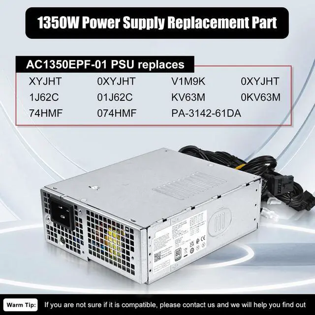 AC1350EPF-01 V1M9K Power Supply CompatibilityKV63M Power Supply Replacement for dell 1350w power supply Compatible with dell XPS 8950 8960 Alienware Aurora R13/R14/R15/R16 Precision T3660 T3680 T7865 Power Supply Repair ^^ 1350W Power Supply Replacement Model Number1350W Dell Power Supply Replaces D1350EPF-00 L1350EPF-00 PA-3142-61DA ^^ XYJHT 1350W Power Supply Replacement Part NumberXYJHT 0XYJHT V1M9K 0XYJHT 1J62C 01J62C KV63M 0KV63M 74HMF 074HMF PA-3142-61DA ^^ Input & Output100-240 V, 50-60 Hz, 15.0 - 9.0A.