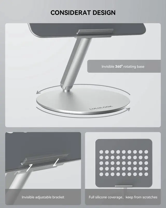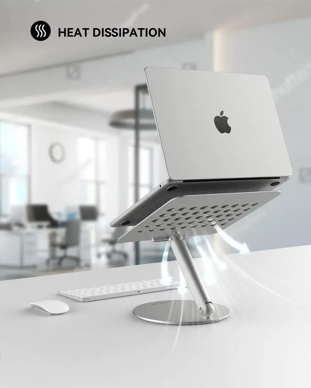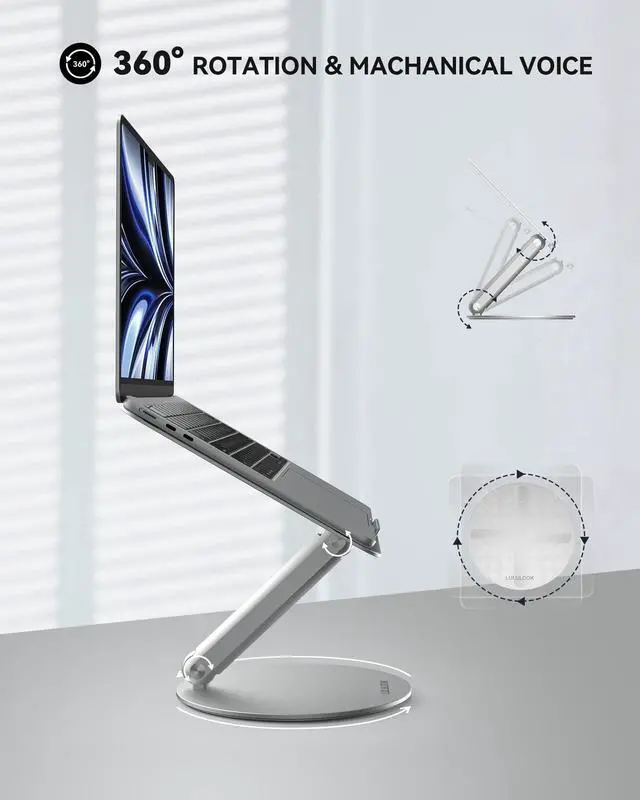 360 Rotation Base Laptop StandLULULOOK rotating laptop stand for desk allows you to easily share your screen with someone sitting across the room or at another desk. This is the perfect solution for anyone who works in an open office plan and wants to participate in meetings without leaving their workstation. It also works great for ideas sessions when collaborating with others over video chat or calls. ^^ Foldable & Height AdjustableThis desktop laptop stand was designed as an amazing adjustable computer pulpit stand that can easy be adjusted for zoom conferences and meetings, watching a movie, video gaming or can even be used for cooking as a cookbook stand.