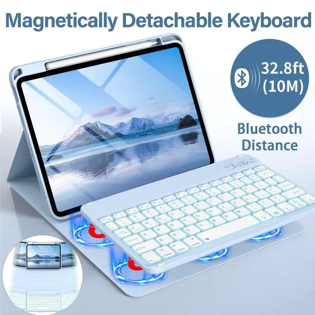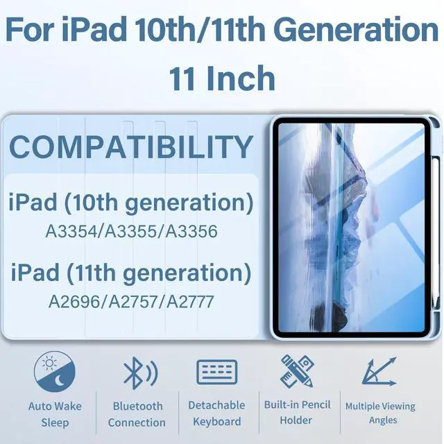 Model Numbers: (A2696, A2757, A2777). It is not suitable for any other models; please ensure you verify the model number on the rear of your iPad before purchasing a case ^^ Magnetic Detachable Backlit KeyboardThis iPad (A16) 11 inch 2025 case with keyboard is magnetic, so the keyboard can be firmly adsorbed, and the shortcut keys make it compatible with iOS, Windows and Android, which is very convenient. This backlit keyboard case for iPad 10.9 -inch 2022 comes in seven colors and two lighting modes to let you choose your favorite hue and brightness. Enjoy a comfortable typing experience even in low-light conditions ^^ Rechargeable Long Life BatteryOur iPad 11th/10th Gen case with keyboard has a built-in 420mAh large-capacity battery, which can be used for up to 420 hours on a single charge. It comes with a Type-C charging cable, which can be fully charged in 2 hours using the Type-C charging cable ^^ Multiple Viewing AnglesThis for iPad 11/10 Generation case with keyboard has 3 grooves to adjust the viewing angle as you like to meet your daily needs. Includes a top pencil holder and pen slot for easy storage.