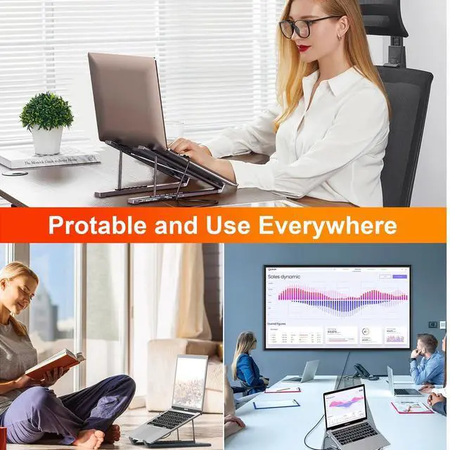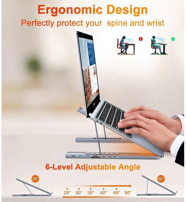 Suitable for viewing television programmes and films, PowerPoint presentations, speeches, etc. (Please ensure your laptop's USB-C port supports DisplayPort Alt Mode for video compatibility). ^^ 5Gbps High-Speed Data Transfer & Expanded ConnectivityTransfer large files in seconds with dual USB 3.0 ports offering speeds up to 5Gbps, perfect for external hard drives, keyboards, and mice. The SD and TF card slots provide convenient access for photographers and creators to manage files directly from their cameras or devices. ^^ 6-Level Ergonomic Stand for Ultimate Comfort Adjust your laptop to the perfect viewing angle with 6 height settings to reduce neck, back, and eye strain.