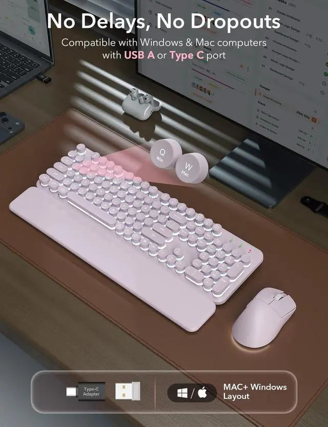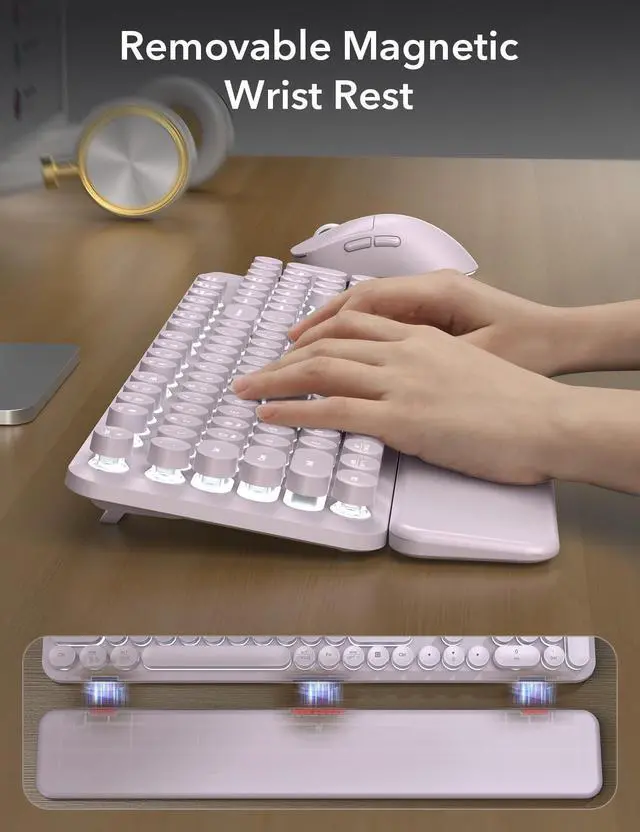 COOL 7-COLOR BACKLIGHT - The wireless keyboard has 7 switchable backlights and an RGB mouse that automatically changes color. Light-up letters help you work better at night and use light effects to improve the atmosphere at workspace. ^^ BLENDING RETRO WITH FASHION - A sleek, modern design with round raised keycaps and spill-resistant technology, this typewriter keyboard helps you stand out in the office. It can showcase its unique charm at home, school, studio, and office. ^^ DETACHABLE WRIST REST - The ergonomic ABS palm rest provides firm support that alleviates pressure on your wrist from typing at an elevated angle.