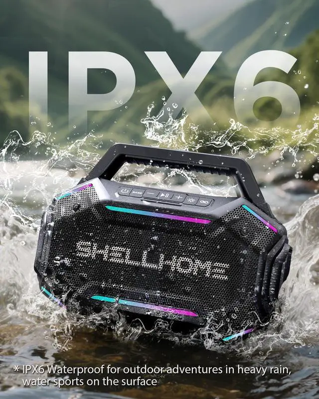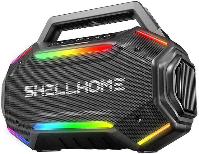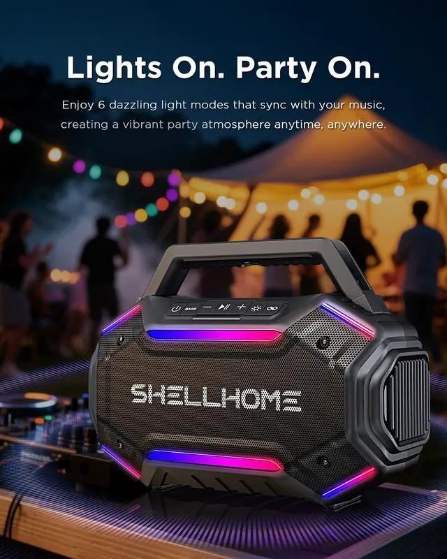 ^^ 30H Long-Lasting Playtime The buletooth outdoor speaker fully charged in just 4 hours, the portable wireless speaker delivers up to 30 hours of continuous playtime. With a built-in power bank, it also keeps your devices charged so you can enjoy music all day without worries. ^^ TWS & Bluetooth 6.0 SHELLHOME party bluetooth speakers equipped with advanced Bluetooth 6.0 technology for faster pairing and more stable connections. Pair two speakers via TWS mode to create true stereo sound for a more immersive listening experience.