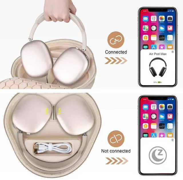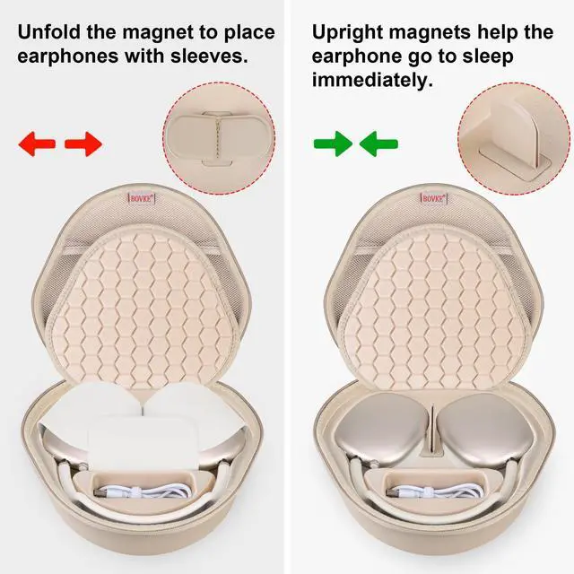 ^^ Sleep Mood: This airpods max case has the magnetic device on the bottom, alllows your AirPods Max into sleep mode in ultra-low-power state, The Bluetooth can be automatically disconnected when you put your AirPods Max in this carrying case and connected immediately when you take AirPods Max out, convenient for daily use. ^^ This Apple AirPods Max headphone case has a special groove and extra mesh pocket to store the charging cable, Apple charger and other Airpods Max accessories, the AirPods Max Headphone can be placed in this protective case alone or used with the Apple headphone orignal smart case. ^^ This airpods max case cover is made of hard EVA material and Soft velvet lining, protects your apple headphone from accidental impact of bumps and drops, waterproof, shockproof and anti-scratch. this Apple airpods max cover is designed with a middle padded soft divider, provides high level of protection, ensures a long-lasting performance for your Apple Over-Ear wireless headphones. ^^ This Apple airpods max case comes with Smooth dual zippers, assure a safe and easy access to your Airpods Max headphone. This AirPods Max headphone holder also has a comfortable hand strap, so that the AirPods Max Headphone can travel with you easily, you can carry it in your hands, in a backpack or in a suitcase.