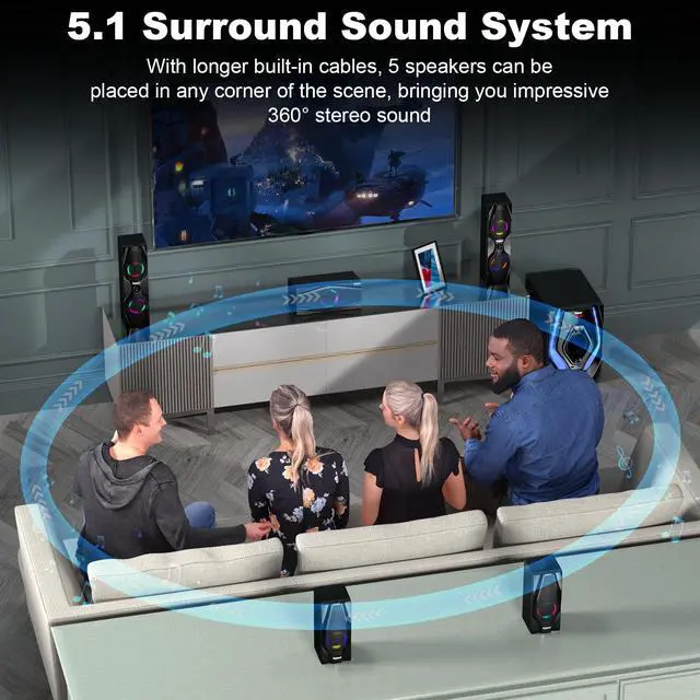 ^^ Multimedia Support: The home surround sound speakers support various smart devices. Bluetooth V 5.3 supports directly connecting with Bluetooth devices; It's also compatible with ARC/OPT/COA/AUX/USB/DVD audio sound inputs. Commonly used cables include ARC Cable/Optical cable/AUX cable/Antenna cable supports any application in need ^^ Long Built-in