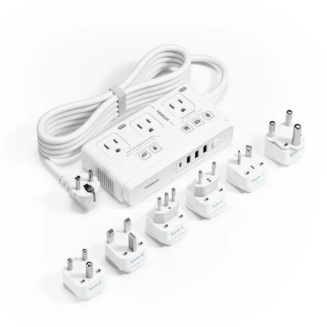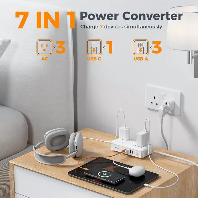 Voltage Converter: This power converter for europe with 3 AC outlets, 1 USB C (3A Max), 3 USB A ( 2.4A Max Per Port), total output is 17W Max; Charge 7 devices simultaneously, meets various charging demands, suitable use at airports, hotels ^^ Portable and