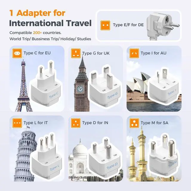 Converter: The power converter adapter combo with a 6ft DE-plug cable and 6 international adapters (Type C, G, I, L, D, M) is compatible with Europe, the UK, Italy, Australia, India, South Africa, Germany, France, Greece, New Zealand, etc ^^