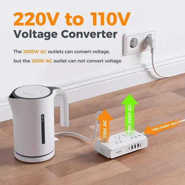 Two Different Conversion Modes: The 2 kW AC outlet converts 220V-240V (50/60 Hz) to 110V (60 Hz) for mechanical-switch household appliances; the 200 W AC outlet has no voltage conversion function and is compatible with cameras, laptops, smartphones, etc ^^ 7 in 1 Travel