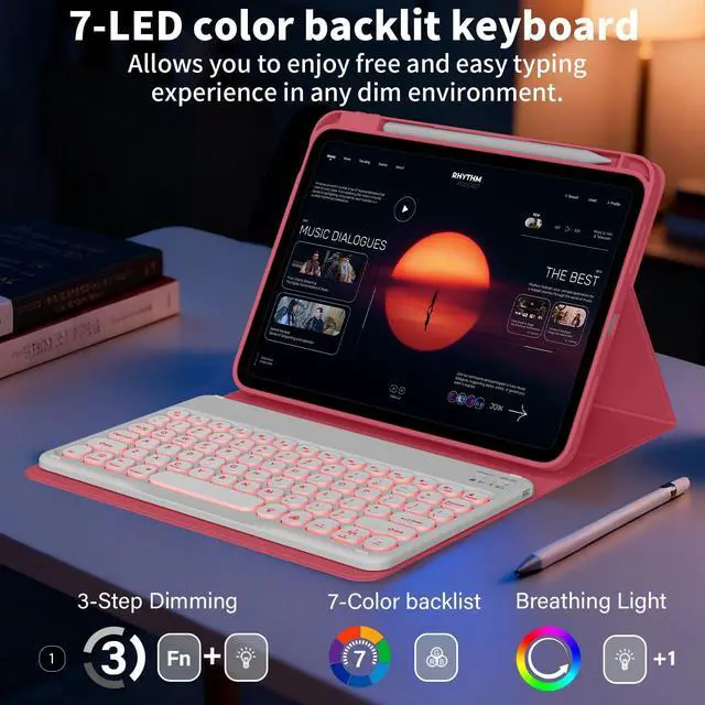 BQDIYOO Keyboard for iPad 11th Gen, 11/10.9inch iPad Case with Pencil Holder, A16 White Round Key case Wireless Backlight Keyboard Case Auto Wake/Sleep, Red