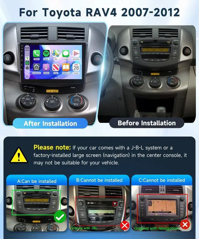 Toyota Toyota RAV4: Introducing our 9-inch Android 13 Car Stereo, equipped with 2GB RAM and 64GB ROM, a stunning 1024*600 HD resolution and 2.5D screen. This touchscreen car radio is only suitable for Toyota RAV4 2007 2008 2009 2010 2011 2012. Please note that it is not suitable for original car center console with JBL premium audio or navigation ^^ Wireless CarPlay and Android Auto Experience the convenience of wireless connectivity with Head unit for Toyota RAV4. Connect your phone wirelessly to access your contacts, emails, notifications, maps, music, and videos. Voice control adds an extra layer of safety and ease, making your drive more enjoyable ^^ Offline Maps /