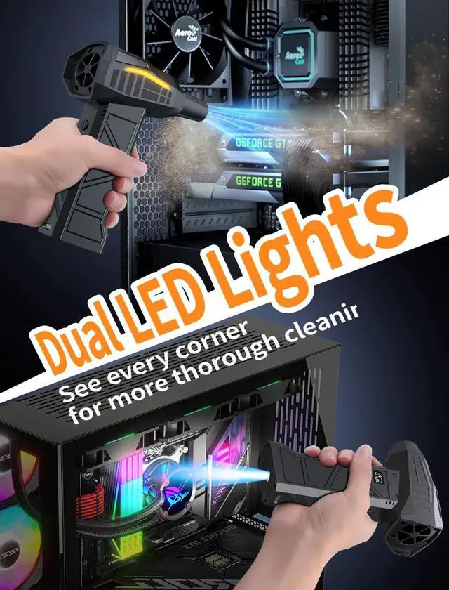 Visibility & Safety: Our rechargeable cordless electric air blower for pc have two super bright LED lights. The LED lights are on the front (work light) and on the bottom handle. The double-ended light exposes dust hidden in dark corners. Also comes with color-coded breathing lights to show gear level: Blue (1) Green (2) Yellow (3) Red (4) - making cleaning fun! ^^ Economical and