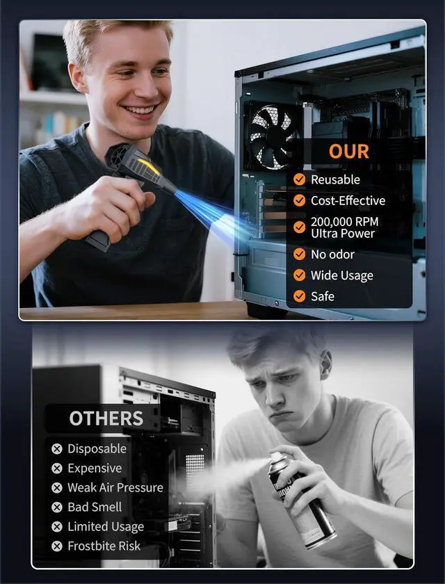 Reusable: The electric air duster with brushless motor weighs only 0.71 pounds, which is lightweight and can be easily put into a pocket or bag. Reusable, durable, and planet-friendly invest once, clean for years. ^^ 10, 000mAh