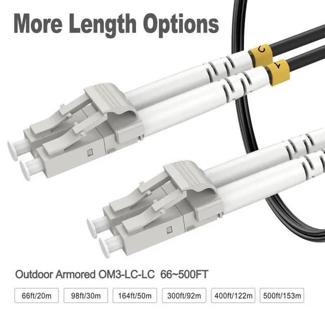 ^^ Long-distance transmission: Our OM3 lc to lc armored fiber patch cable provides 2000 MHzkm @850nm bandwidth, allowing for 10Gb Ethernet transmission up to 300 meters at 850nm wavelength. 40Gb Ethernet transmission distance can reach 240 meters at 850nm wavelength, while 100Gb Ethernet transmission distance can reach 100 meters at 850nm wavelength. ^^