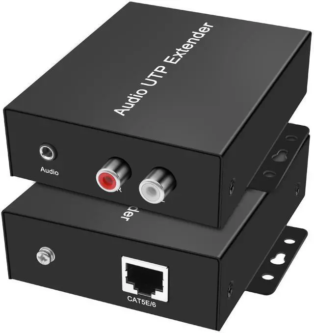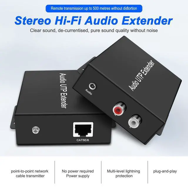 This stereo HI-FI RCA audio extender is a twisted pair extension device for stereo hi-fi audio signals. It transmits audio signals via a CAT5e/6 cable over a distance of up to 500 M/1640FT without distortion, ensuring clear sound quality. The device effectively removes current interference, providing pure audio output free from noise and addressing the challenge of remote audio signal transmission. ^^ This 3.5 mm/RCA stereo audio UTP extender adopts metal housing, fast heat dissipation, durable, gold-plated plug, oxidation resistance, plug resistance, stable transmission, long service life.