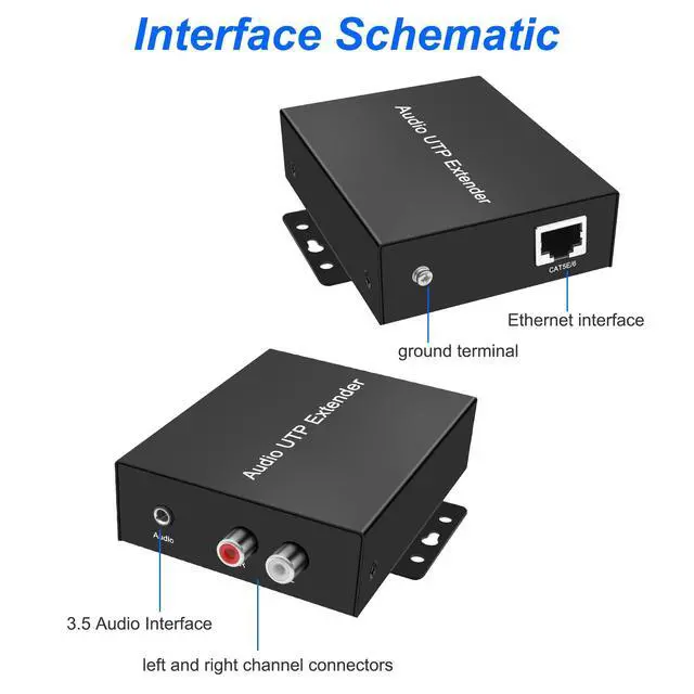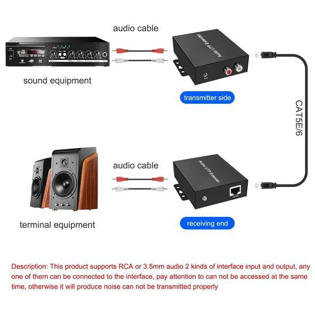 Note: Support RCA or 3.5 mm audio interface one of the interface input and output, can not be connected at the same time, otherwise the noise will cause the normal transmission. ^^ The 3.5 mm/RCA Over Cat5e/Cat 6 Analog Audio Extender can be used in game console HI-FI audio equipment, set-top box, Hi-Fi home theater, large screen projection video conferencing, public video broadcasting system, remote multimedia education, classroom medical, tablet video media advertising transmission demonstration.