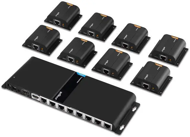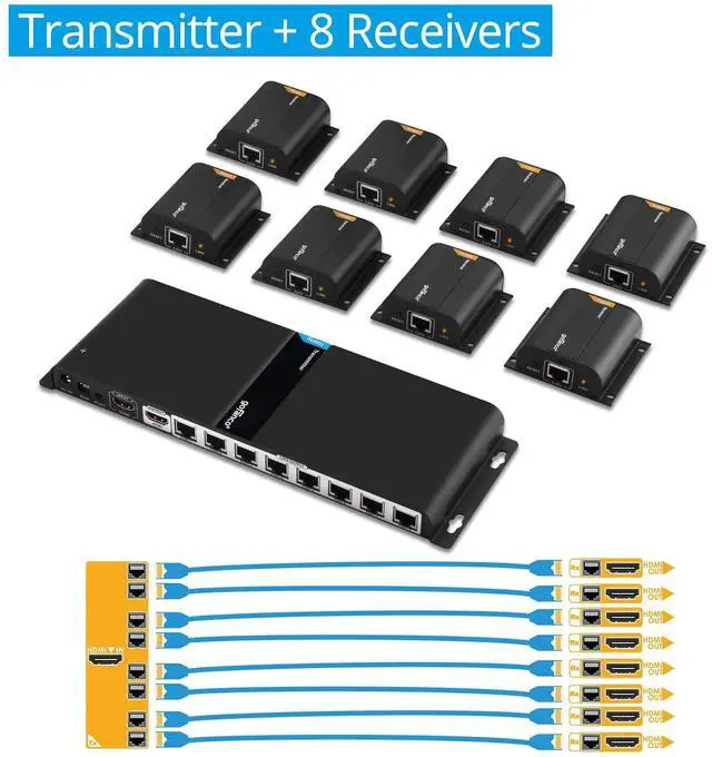 1x8 HDMI Extender Splitter COMPLETE KIT - Includes 1 Transmitter & 8 Receivers. Extend and distribute 1 HDMI source to 8 HDMI displays over CAT6/6a/7 simultaneously.