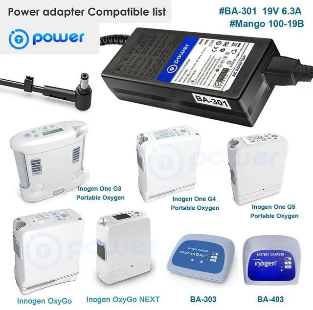 Compatible with: BA-301 19V 6.3A Mango 100-19B, BA-401, 19V 3.42A MANGO65-19CB-ING, Inogen One G4 Power Supply for IO-400 BA-403 Power Cord, ^^ and for G4 Inogen One External Battery Charger BA503, BA-503, BA-516 BA-316, model: ATM065-A190, P/N: mA65-1019-3 (19V 65W) ^^ for battery BA-303 BA-403 BA-503 19V 5.3A, G4 External Battery Charger BA-403 This is for use with BA-400 and BA-408 Batteries. This also works for OxyGo Fit batteries.