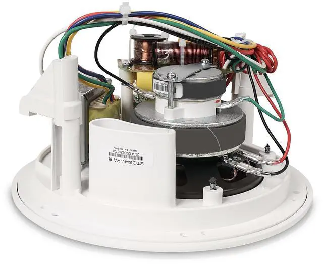 This ensures a seamless integration with virtually any professional sound system. Flush-mount installation provides secure mounting to ceilings in both residential and commercial settings. With its white-painted magnetic grill, the STCS4N-PAIR offers a sleek, elegant finish that matches many different types of environments and settings while the 140 conical sound coverage ensures immersive sound dispersion to your audience. This makes the STCS4N-PAIR flush-mount in-ceiling speakers an optimal choice for venues like restaurants, cafes, bars, lobbies, conference rooms, auditoriums, retail stores, casinos and much more!